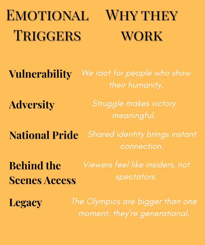 Olympic content resonates so deeply because it taps into emotional triggers that are universal.